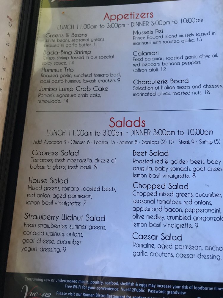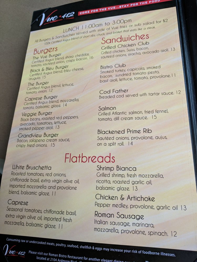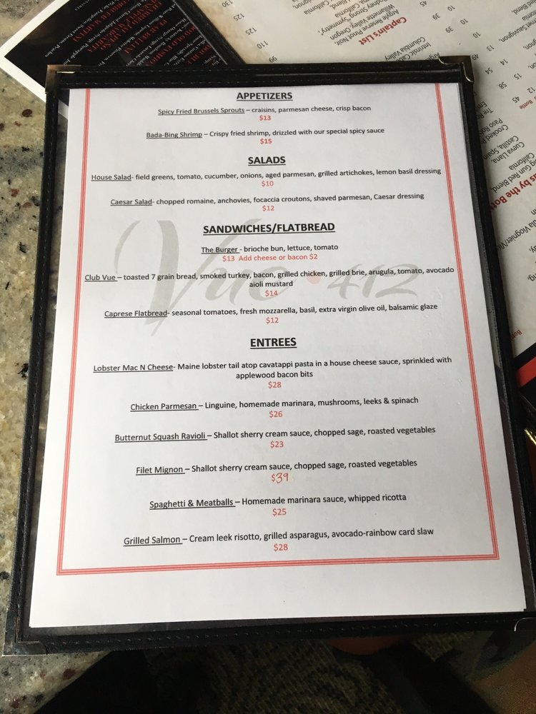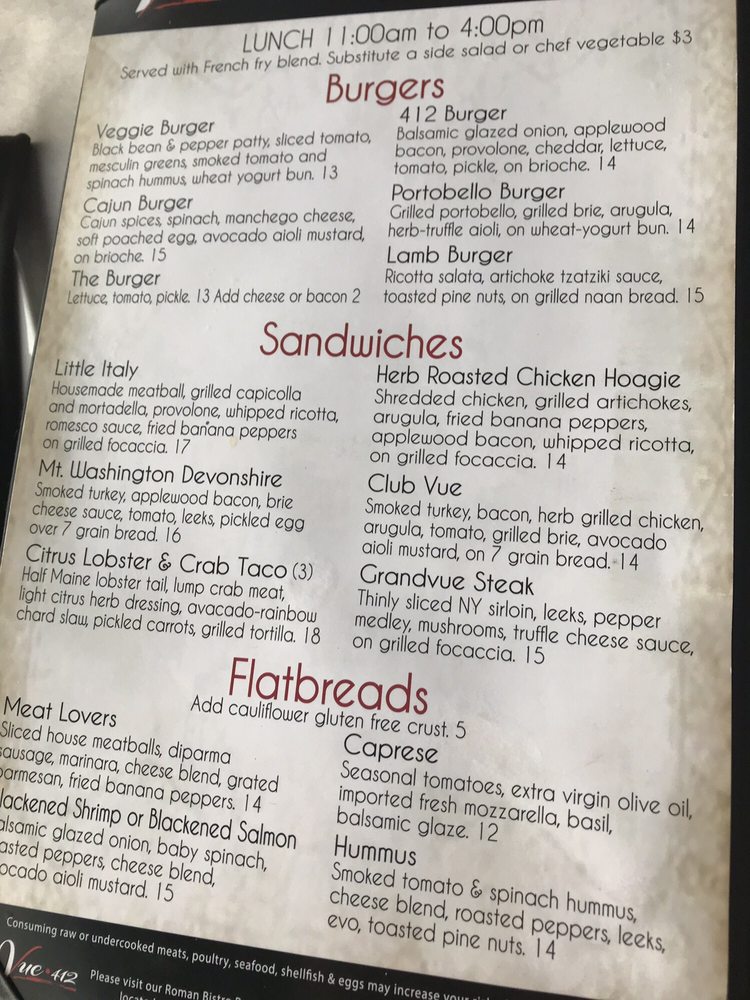 Vue 412 is a classy and romantic restaurant situated at 1200 Grandview Ave in Pittsburgh, PA. Offering a range of delicious dishes, including a Charcuterie Board, Lemon Chicken Soup, and flavorful salads like Caprese and Kiwi Pecan. Customers praise the stunning views of the city and the attentive service provided by the staff. The stuffed banana pepper ravioli and lobster mac and cheese are stand-out dishes that receive high praise. The restaurant also caters to various dietary preferences with vegan and vegetarian options available. Overall, Vue 412 is a must-visit spot for a memorable dining experience with a picturesque backdrop.